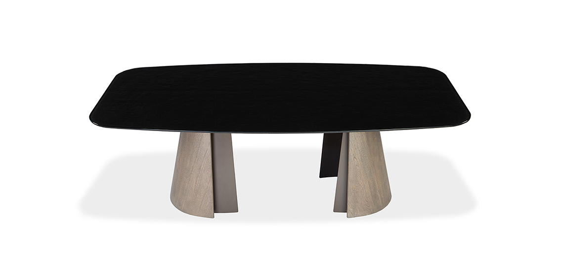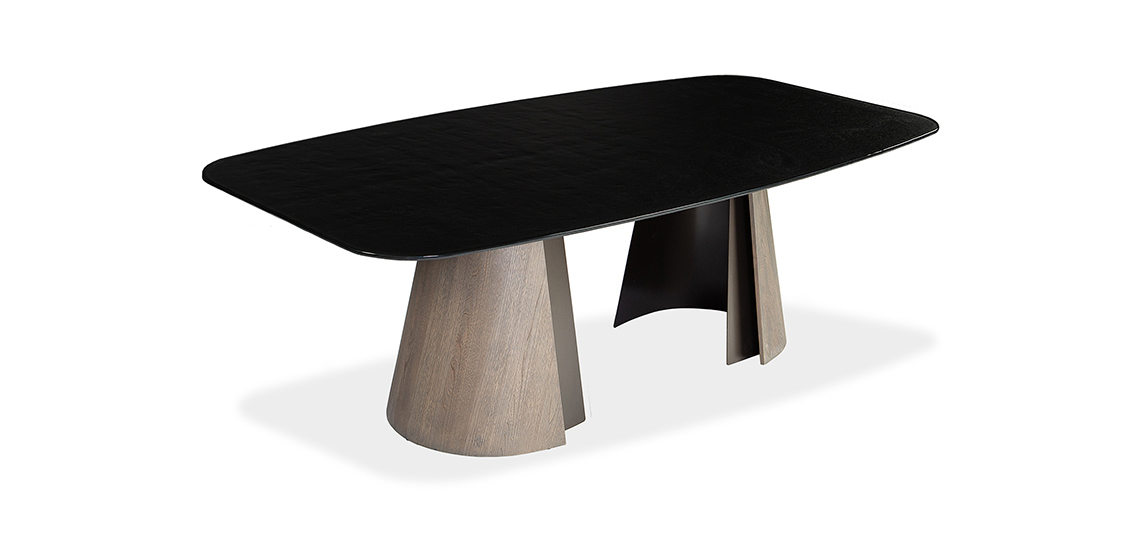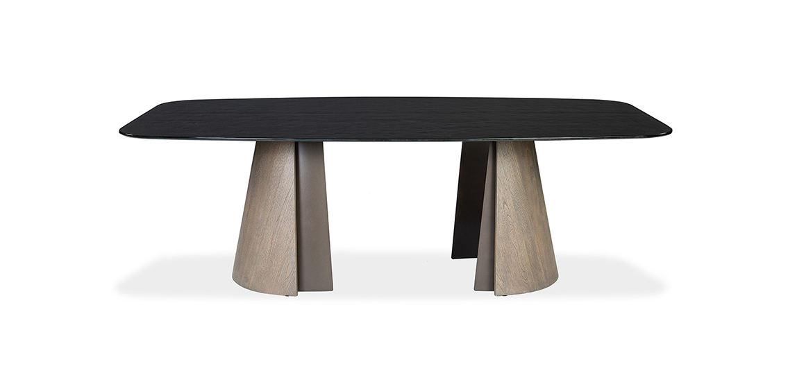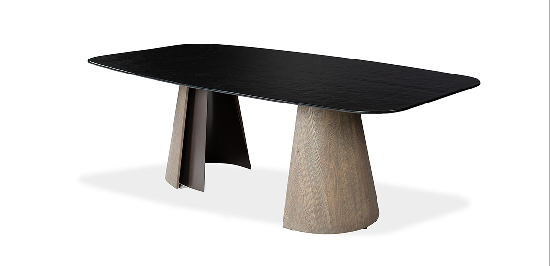 The Brandon table features a strikingly designed base that effortlessly combines strength, sophistication, and style. The outer wood veneer pairs beautifully with a dark bronze metal inner layer, creating a refined contrast of materials. Finished in a rich walnut stain, the base offers both durability and timeless appeal, ensuring it will remain a standout piece for years to come. The Brandon table is available with a variety of tabletop options, including contoured, rectangular, matte and polished ceramic, or glass tops. This wide range of choices makes the Brandon a versatile and adaptable option for any space, whether for a contemporary home or a professional setting.
