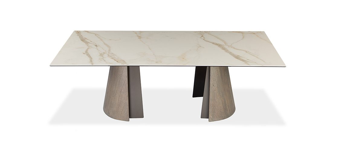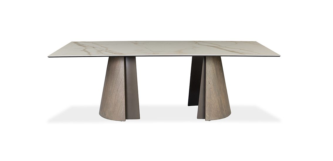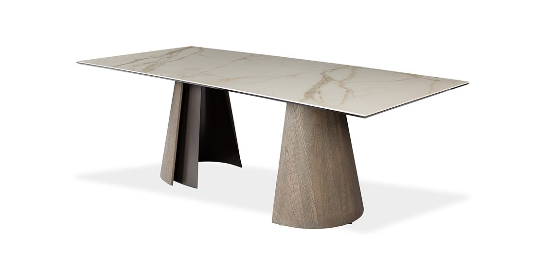 The Brandon table features a strikingly designed base that effortlessly combines strength, sophistication, and style. The outer wood veneer pairs beautifully with a dark bronze metal inner layer, creating a refined contrast of materials. Finished in a rich walnut stain, the base offers both durability and timeless appeal, ensuring it will remain a standout piece for years to come. The Brandon table is available with a variety of tabletop options, including contoured, rectangular, matte and polished ceramic, or glass tops. This wide range of choices makes the Brandon a versatile and adaptable option for any space, whether for a contemporary home or a professional setting.