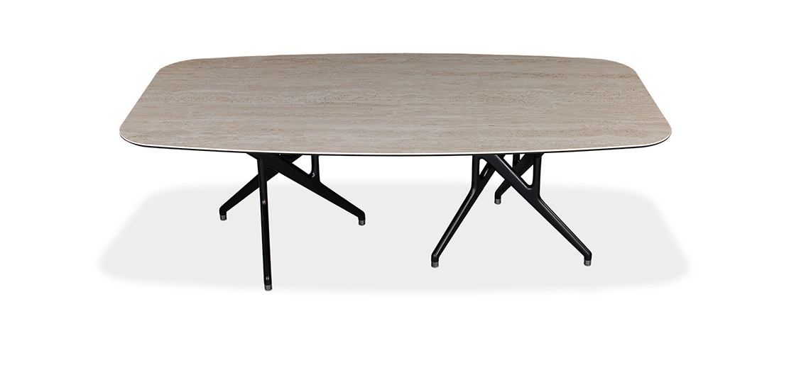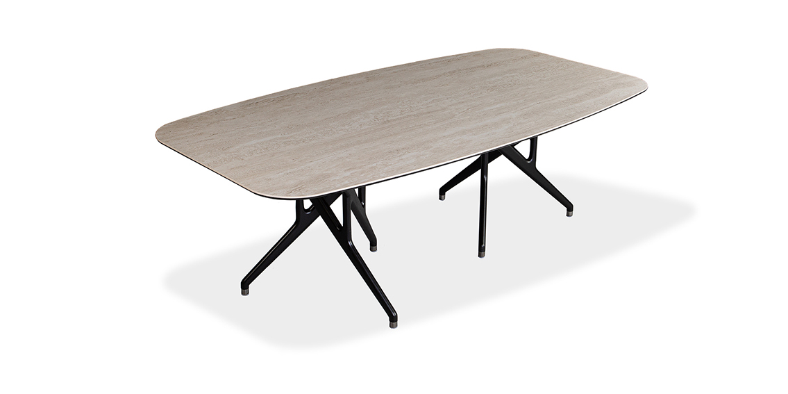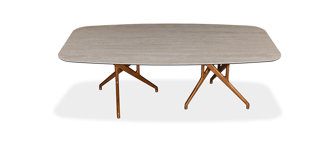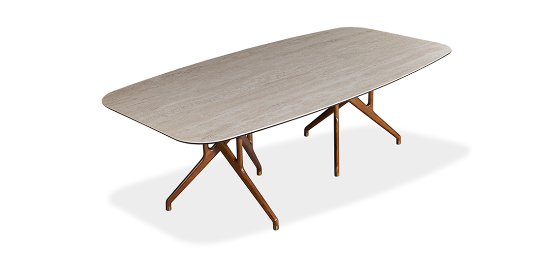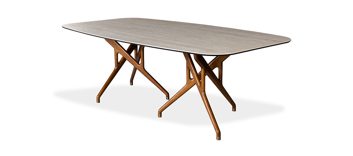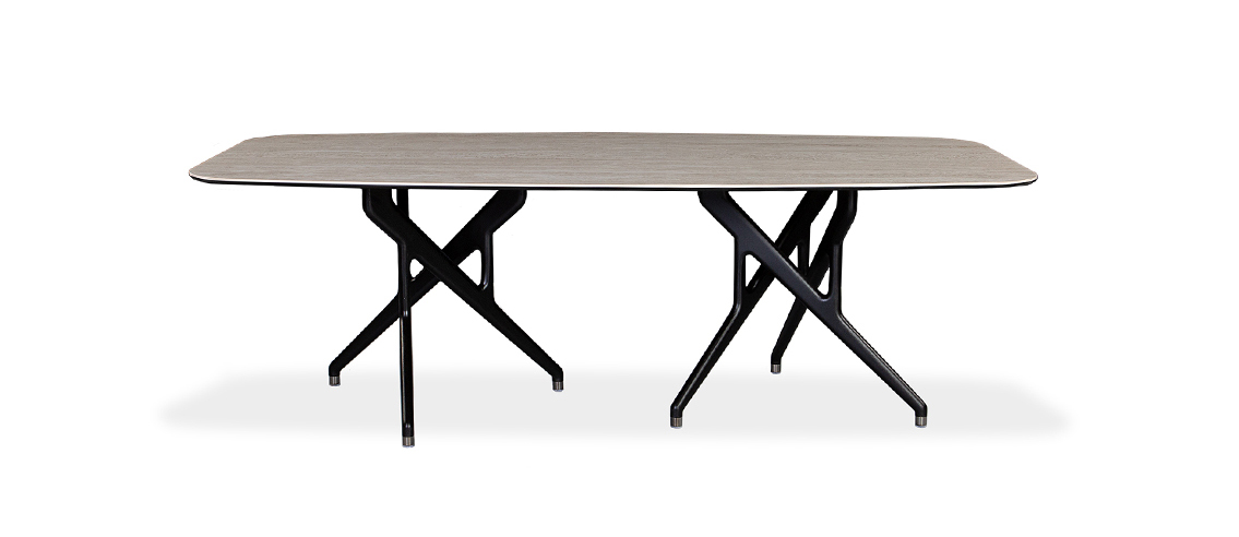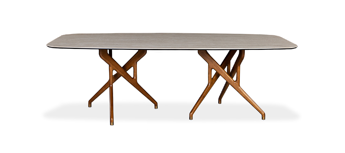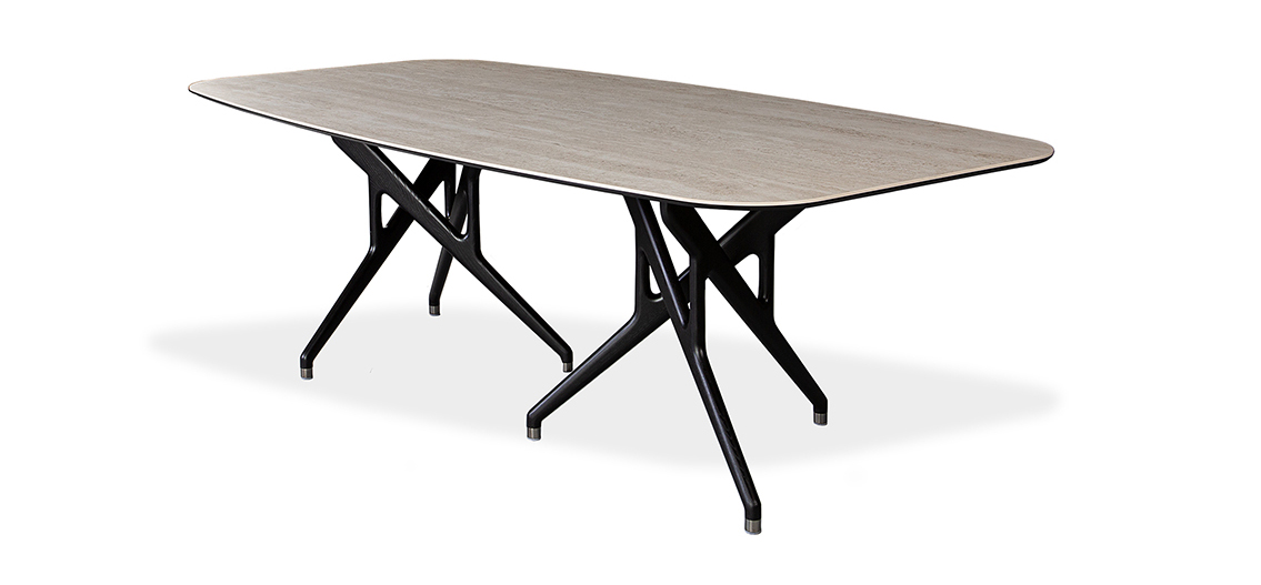 Rafa features two bases, each crafted with a set of three ash wood legs – elegantly intertwined and finished in either a rich walnut stain or sleek black. This unique, sculptural design draws inspiration from the bold lines of Catalan architecture, blending complexity with a striking sense of harmony. Whether paired with a glass or ceramic top, Rafa’s dramatic yet refined aesthetic creates a stunning focal point, adding both character and sophistication to any dining room.